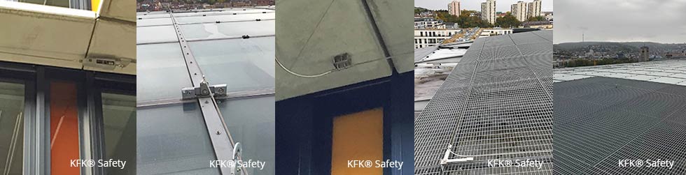Die BG-Information DGUV 201-056 2015 Planungsgrundlagen von Anschlageinrichtungen auf Dächern 2015 sollte beachtet werden. Einzelanschlagpunkte, Sekuranten*, horizontale Seilsysteme, Schienensysteme, Edelstahlseilsysteme, nach DIN EN 795, DIN EN 365, BGR 198 Absatz 8.2, DIN EN 517 zur Absturzsicherung auf Dächern, Flachdach, Dach, Fenster, BGI 5164, Temporäre Seitenschutzsysteme nach DIN EN 13374, KFK® führt die Safety Sachkundigenprüfungen, UVV Prüfung von Auffangsystemen Prüfung von Leitern, Steigleitern durch.